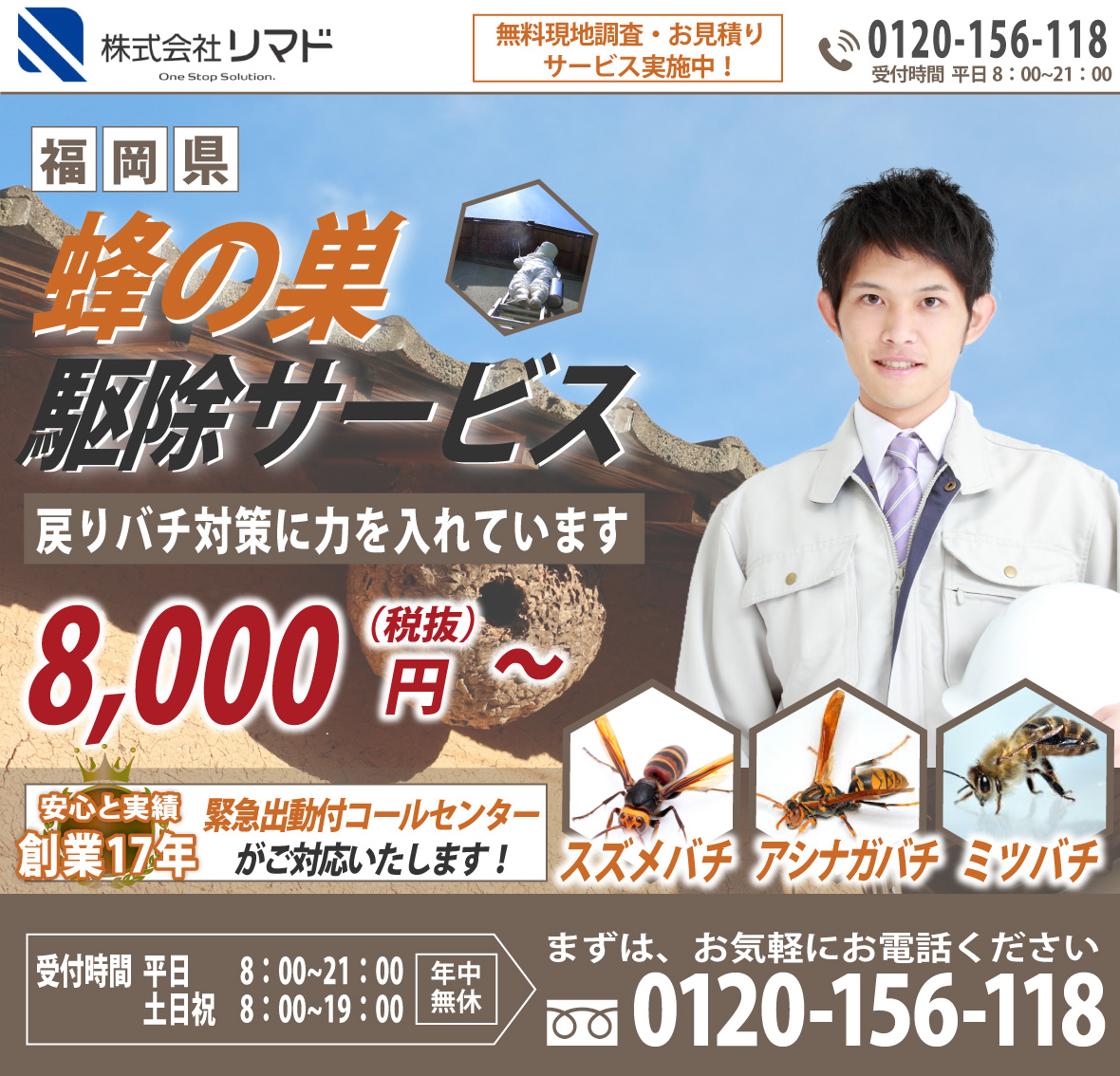 電話をかける(click)ハチ駆除をお考えの際は、プロのハチ駆除業者に依頼することをおすすめいたします。ベランダ、軒下、家の玄関や庭などにハチの巣が作られてしまうと、ハチが部屋の中に入ってしまわないか、ハチに刺されてしまわないかと心配ですよね。また家の周りで蜂が飛んでいると、お隣やご近所の方にもハチ被害でトラブル、ご迷惑をお掛けすることにもなってしまいます。そうなってしまう前にハチ駆除会社に依頼をしてスムーズに解決してしまいものです。それでは、多くの業者の中からどの業者に依頼すればいいのでしょうか?依頼を検討するにあたり、料金や対応の早さ・正確さ、アフターサービスなど気になることは多くありますよね。そこで少しでも低価格、早く、安全、安心に蜂の巣駆除を終わらせるために業者選びで知っておきたいポイントをご紹介します。まず、ハチ駆除料金を比較する際は事前に現地調査を行ってもらいましょう。駆除にかかる費用は、巣の大きさ・場所・高さ、ハチの種類によって変わってきます。また、蜂の巣は軒先や窓際といった場所だけでなく屋根裏(天井裏)、床下といった見つけにくい場所に作られることもあります。そのため正確な見積もりを提示してもらうためにも十分な現地調査は欠かせません。また、駆除の値段はお客様によってそれぞれなので、見積もり価格が業界の相場・適正料金か見極めるのも難しいことかと思います。よくあるトラブルは現地調査が不十分で追加工事・追加料金が発生してしまった、作業費用と清掃費用が別途料金で請求金額が見積りから大きく増えてしまったというものです。そこで見積もりの詳細(内訳)を納得できるまで丁寧にわかりやすく説明してくれる業者が信頼出来る優良業者といえます。また、今日中(本日中)に、翌日にでもハチ駆除を終わらせたいというお客様もみえることかと思います。そこで依頼から即日対応・即日解決・即日駆除ができる業者をおすすめいたします。そして、徹底的にハチ退治、ハチの巣除去をしてもらうために、蜂の巣駆除会社の実績も確認しておきましょう。ハチ駆除には資格や免許、許可などが必要ないので知識や技術がない素人でも作業ができてしまいます。その際、対応が不十分だと戻りバチや蜂の巣の再発といった問題が起きてしまうこともあります。実績豊富な業者であれば、ハチ駆除の知識や技術を持つ専門家のスタッフが駆除から蜂の巣の撤去・処分、再発防止のケアまで行うことができます。また、口コミやランキングサイトで業者の評判も調べてみましょう。評価の高い人気の業者、おすすめされている業者の具体的な対応や施工例など業者選びの参考になるかと思います。弊社では、ご相談、現地調査、お見積もりまで全て無料でご利用頂けます。現地調査の際は、ご依頼から最短40分で駆けつけ、緊急時にもご対応いたします。ミツバチは10,000円から、アシナガバチは11,000円、スズメバチは13,000円から適正料金でハチ駆除サービスをご案内しております。プロの駆除技術にあわせて専用の薬剤を使用することで徹底的な蜂駆除、蜂の巣の除去から、戻り蜂対策、再発予防までしっかりと行います。また、年中無休365日・通話料無料の相談窓口を設けております。ご相談には研修を受けた専門スタッフがご対応いたしますのでちょっとした質問からでも、お気軽にご相談ください。安心・安全にハチ駆除をしたい、ハチ被害でお悩みの方は、まずは弊社にお問い合わせください。
